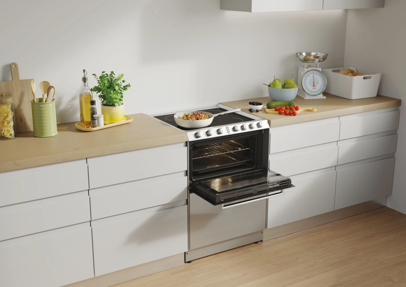 Mindössze 60 cm-es helyen főzőlap, sütő és mosogatógép is rendelkezésre áll, így minden szükséges készülék egyből kéznél van.