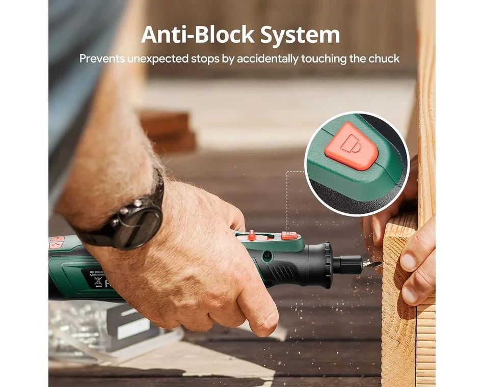 A Depstech DC08 8V-os forgószerszám akkumulátoros, mégiserős és stabil teljesítményt tudnyújtani. Az 5 változtatható fordulatszám5000 és 30 000 fordulat/perc között rugalmas forgási sebességbeállításokat tesz lehetővé. Asebességbeállítást is képes megjegyezni, így nem kell folyamatosan állítania a sebességet rövid időközönként. Az 5 perc elteltével visszatér az alapértelmezett sebességfokozatra. Szinte mindenbarkácsolási és barkácsolási igényét kielégíti. Ez a vezeték nélküli forgószerszám 2000 mAh-s akkumulátorral és USB Type-C töltőcsatlakozóval rendelkezik, amely megkönnyíti a töltést, bárhol is legyen.