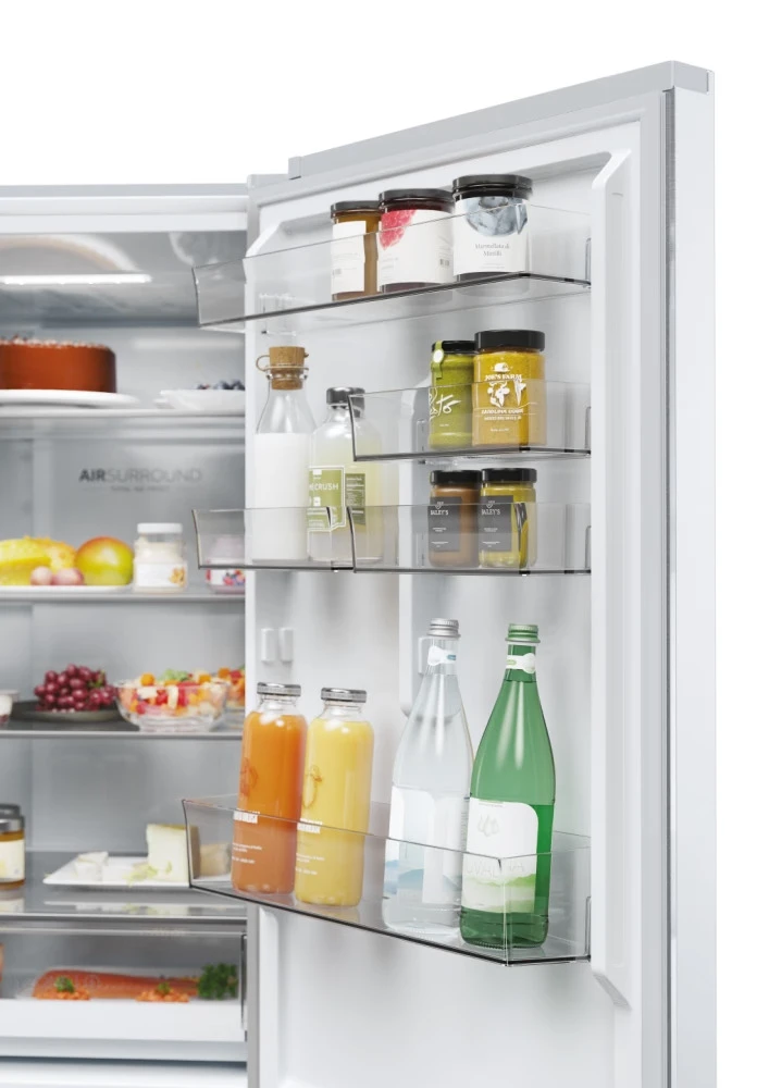 A Haier Air Surround Fresher Tech segítségével a levegő lágyabban áramlik a hűtőszekrény belsejében. A speciális laterális nyílásoknak köszönhetően ez a rendszer egyenletesen oszlatja el a hideg levegőt, amely átöleli az élelmiszereket a hűtőszekrény belsejében, így elkerülhető a hideg levegő közvetlen áramlása az élelmiszerekre, elkerülve a súlycsökkenést és kiszáradást. Így a Haier Air Surround megőrzi az ételek ízét, állagát és lédússágát akár 99%-ban*, és azok 7 nap elteltével is ugyan olyanok frissek lesznek, mint az 1. napon. *A vizsgálati eredményeket egy független külső műszaki laboratórium adta ki, amely összehasonlítja a Total No Frost Circle + technológiával felszerelt hűtőszekrényt egy közvetlen áramlási technológiás hűtőszekrénnyel