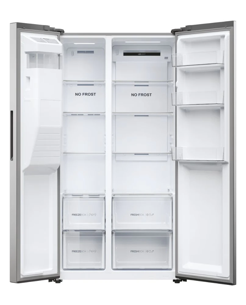 A 90 cm széles Haier Side By Side hűtőszekrények nagy kapacitást biztosítanak, miközben könnyű hozzáférést nyújtanak a hűtő- és fagyasztóterekhez. A tágas tárolóhely lehetővé teszi, hogy nagy mennyiségű élelmiszert tárolj egyszerre, miközben a hely zsúfoltság mentes és rendezett marad. Elegáns kialakításuk bármilyen konyhastílushoz illeszkedik, és az érintőkijelzőn bármikor beállítható a tökéletes hőmérséklet igényeid szerint. Ezek a hűtőszekrények Total No Frost technológiával és 90°-os automatikus leállási csuklópánttal büszkélkednek.