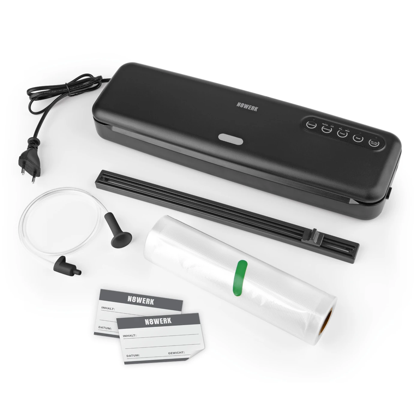 Az N8WERK vákuumzáró készülékkel könnyedén csomagolhatja élelmiszereit vákuum alá - teljesen természetes módon, tartósítószerek nélkül - ideális friss élelmiszerekhez, mint például hús, gyümölcs, zöldség, tenger gyümölcsei, vagy akár száraz élelmiszerekhez, mint például kávébab, diófélék, müzli és még sok más. Az ételek légmentesen lezárva, -0,8 bar nyomáson kb. 90%-os vákuumteljesítménnyel - hűtőben való tároláshoz, fagyasztáshoz és porciózáshoz vagy a sztárkonyha egyik trendjének számító sous-vide főzéshez.