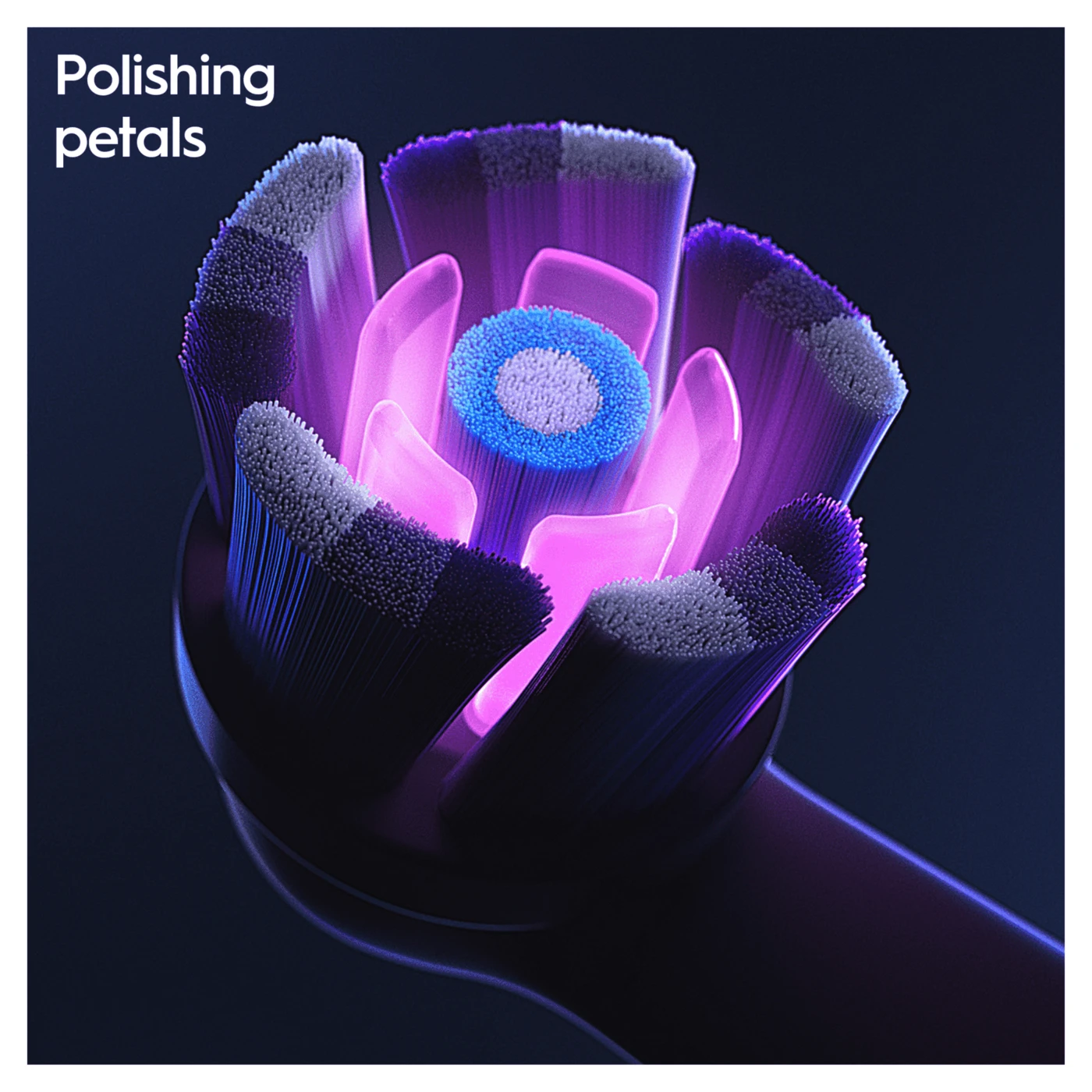Az Oral-B iO Series Radiant White pótfejek a hatékony, ugyanakkor gyengéd mikrovibrációkat a fogorvosok által inspirált, kerek fogkefefej-kialakítással ötvözik, így nap mint nap a professzionális tisztaság érzését nyújtják. A kifejezetten az Oral-B iO elektromos fogkefe markolatához tervezett Radiant White pótfejek akár 100%-kal több lepedéket segítenek eltávolítani - az Oral-B manuális fogkefékhez képest -, a tiszta és ragyogó fogakért. A Radiant White fogkefefej a tökéletes szögben döntött sörtéket polírozó elemekkel ötvözi, így minden fogfelülethez hozzáfér, políroz és segít eltávolítani a felületi elszíneződéseket, hogy mosolya fehérebben ragyogjon. Mivel a legkiválóbb eredmény érdekében a fogorvosok 3 havonta javasolják a fogkefefej cseréjét, az Oral-B pótfejek színváltó sörtékkel rendelkeznek, amelyek jelzik, ha eljött a csere ideje. Élvezze a kimagasló tisztítóhatást az egyetlen, kifejezetten az Oral-B iO elektromos fogkeféhez tervezett, és ahhoz garantáltan illeszkedő pótfejjel!