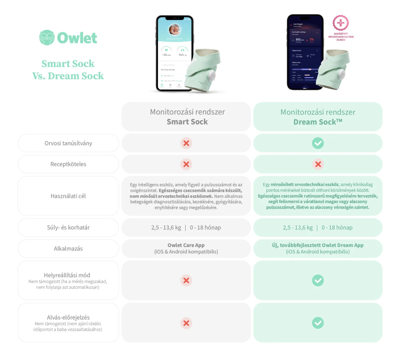 Szeretné szemmel tartani a babáját, amíg alszik? Az okos Owlet Dream Sock segítségével maximális nyugalmat élvezhet. Ez egy egészségügyi tanúsítvánnyal rendelkező zokni, amely a baba lábára tekerve figyeli pulzusát, véroxigénszintjét és alvási trendjeit. Minden adatot valós időben figyel, és jelent a bázisnak. Ezeket az értékeket közvetlenül a mobiltelefonján követheti a hasznos Dream alkalmazás segítségével. Ezen keresztül irányíthatja is egyben. A bázis és az alkalmazás is azonnal értesíti Önt, ha valami szokatlan történik. Az intelligens Owlet Dream Sock fejlett technológiával biztonságot nyújt a baba számára, de egyben nyugalmat Önnek, mint szülőnek. A zokni 0 és 18 hónapos kor közötti, 2,5 és 13,6 kg közötti egészséges csecsemők számára alkalmas.