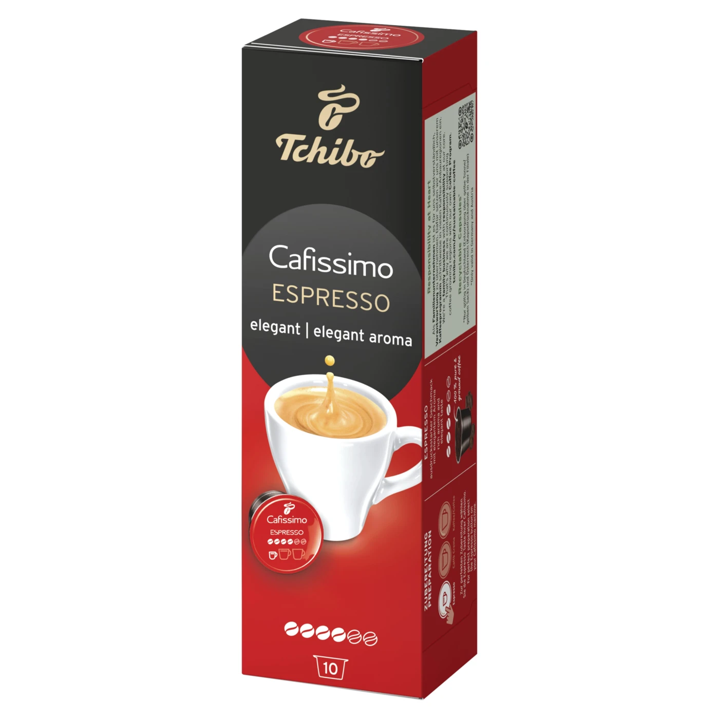 Fedezze fel ezt az olasz mintára, eleganciát kedvelő kávéfogyasztóknak készült eszpresszót! A Tchibo Cafissimo Espresso Elegant lágyabb íz világot képvisel, mert Tchibo kávébabból és kíméletes, egyedi pörköléssel készült. Citromos aromájú, enyhén csokoládéra emlékeztető, kissé gyümölcsös jellegű íz jellemzi.