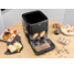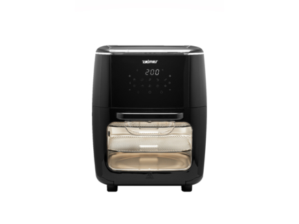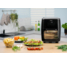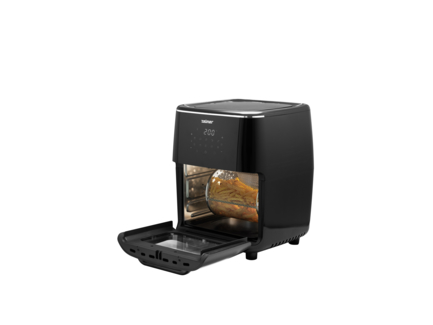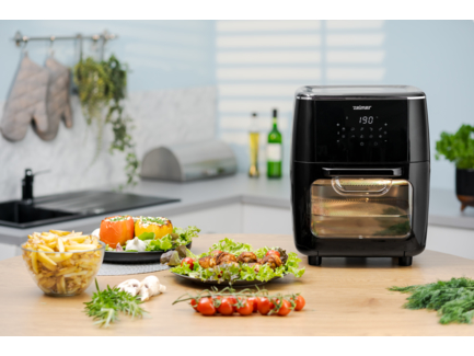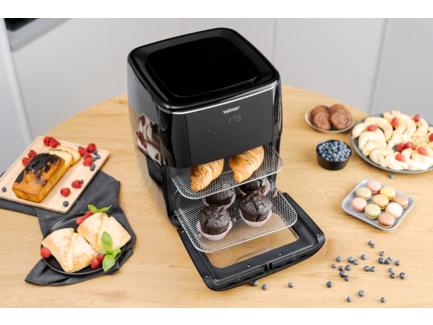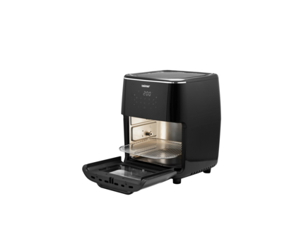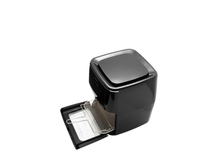 6 tartozék: 2 tepsi, olajtálca, leadó rács, 2,9 literes forgó kerek kosár és forgóhorgok