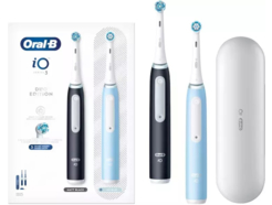 2 db Oral-B iO3 elektromos fogkefe készlet mágneses technológiával és mikrovibrációkkal, intelligens nyomásérzékelővel, 3 üzemmóddal, 2 fejjel, utazókészlettel, fekete/kék