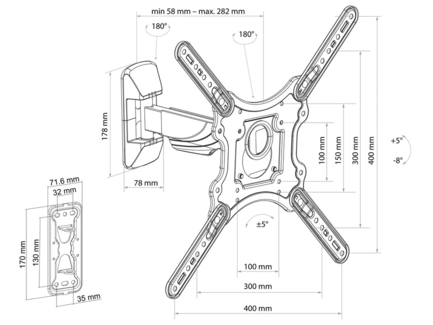 VESA szabvány: 100 x 100, 100 x 150, 200x100, 200 x 200, 400 x 400